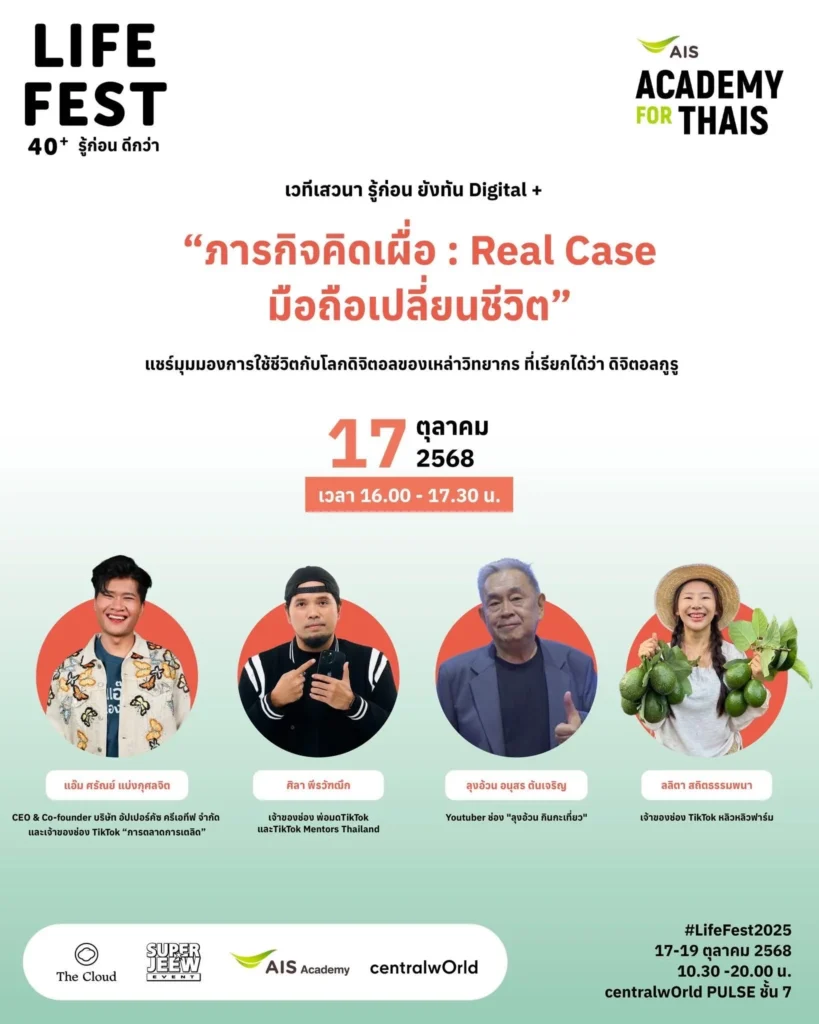 ทั้งนี้ ยังมีกิจกรรมเวิร์กชอปและสิทธิพิเศษที่บูธ AIS ACADEMY for THAIs ในวันศุกร์ที่ 17 ตุลาคม 2568 เวลา 10.00 – 20.00 น. ณ centralwOrld PULSE ชั้น 7 ผู้สนใจสามารถลงทะเบียนเข้าร่วมงานฟรี ดูรายละเอียดเพิ่มเติมที่เพจ AIS Academy