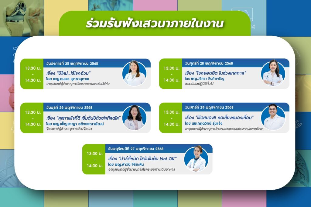 อีกหนึ่งไฮไลต์ที่หลายคนรอคอยคือ “Doctor Talk” เวทีที่รวมทุกหัวข้อสุขภาพใกล้ตัวของคนยุคใหม่ไว้อย่างครบถ้วน โดยแพทย์ผู้ชำนาญการจะสลับกันมาแบ่งปันประสบการณ์จริงแบบเข้าถึงง่าย ในเวลา 13.30–14.30 น. ทุกวัน ไม่ว่าจะเป็นเคล็ดลับการควบคุมน้ำหนักอย่างยั่งยืน