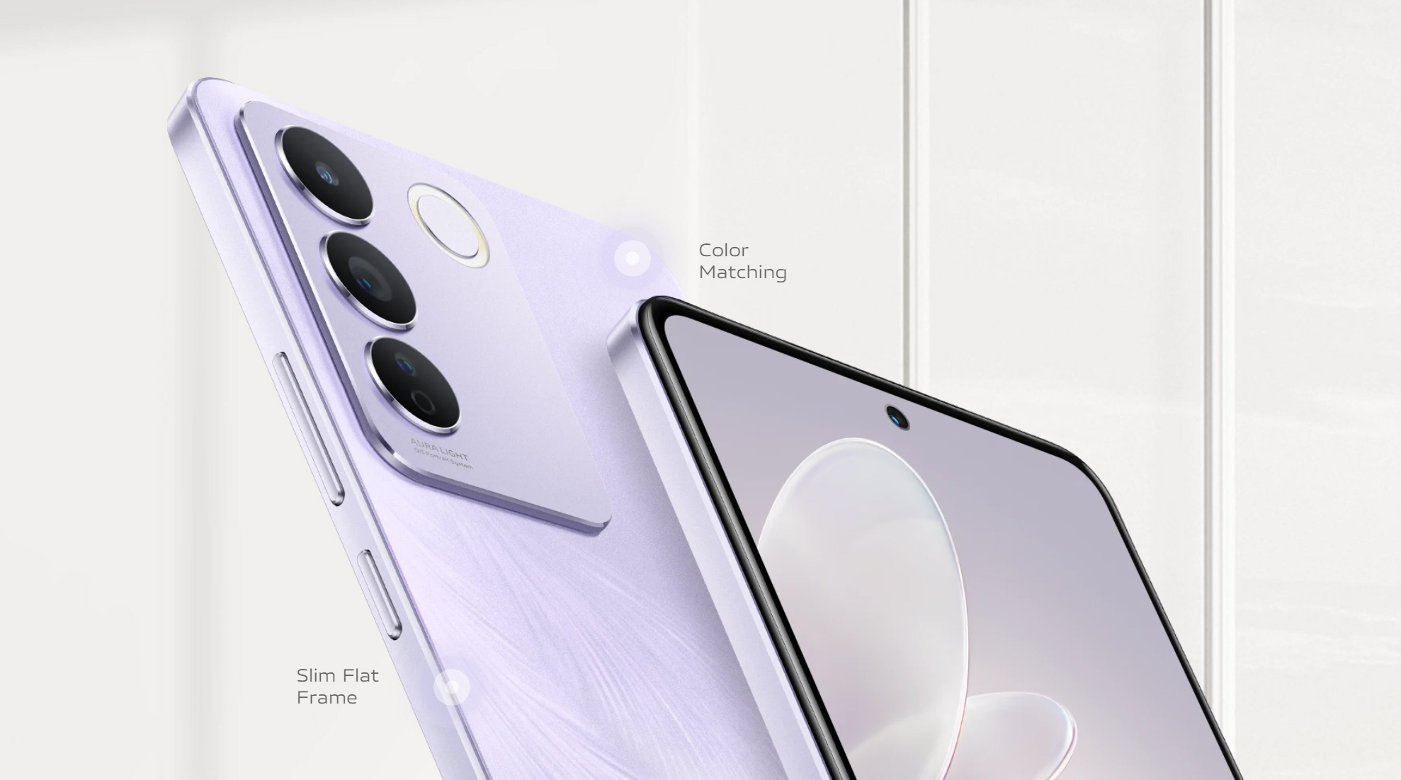 นอกจากวันเปิดตัวแล้ว ในหน้า Landing Page ยังได้เผยดีไซน์ของ vivo V27e ที่มาในดีไซน์ขอบเหลี่ยมและบาง หน้าจอแสดงผลแบบ Punch Hole Display เจาะรูฝังกล้องเซลฟี่ที่ตรงกลางด้านบน
