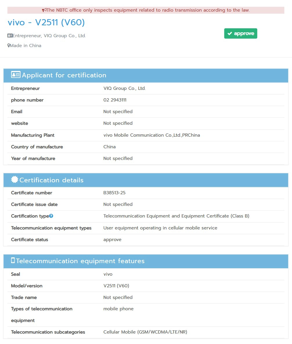 สำหรับข้อมูลของ vivo V60 ที่ผ่านการรับรองจากหน่วยงานกสทช. ประเทศไทย มาพร้อมหมายเลขรุ่น V2511 และระบุว่ารองรับ 5G แต่น่าเสียดายที่ยังไม่มีข้อมูลสเปกหลักเผยออกมาในตอนนี้