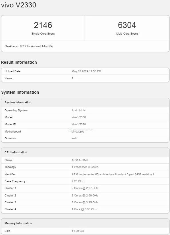 สำหรับสเปกของ vivo หมายเลขรุ่น V2330 หรือ vivo X Fold 3 Pro ที่ปรากฎบนแอป GeekBench 6 ใช้หน่วยประมวลผลซีพียูแบบ Octa Core ความเร็ว 2.20GHz โดยมี CPU สองคอร์ทำงานที่ 2.27GHz, CPU สองคอร์ทำงานที่ 2.96GHz, CPU สามคอร์ทำงานที่ 3.15GHz และ CPU หนึ่งคอร์ทำงานที่ 3.30GHz