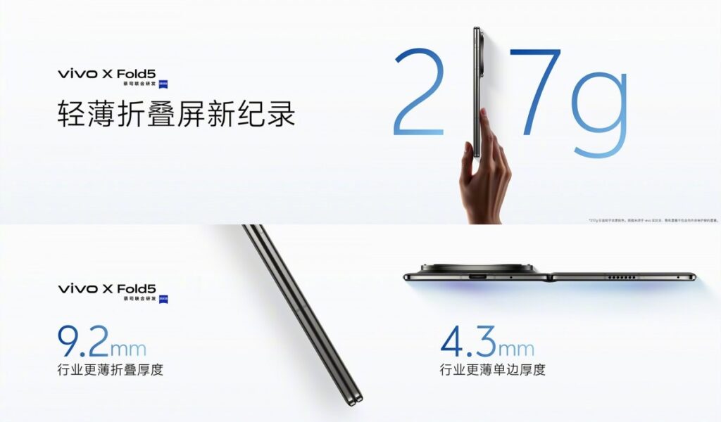 vivo ประกาศเปิดตัว vivo X Fold 5 อย่างเป็นทางการในประเทศจีน ซึ่งถือเป็นก้าวสำคัญในตลาดสมาร์ตโฟนจอพับได้ โดย X Fold 5 ทำตลาดในฐานะสมาร์ตโฟนจอพับได้ขนาดใหญ่ที่เบาที่สุดในโลก มีน้ำหนักเพียง 217 กรัมในสีไททาเนียม