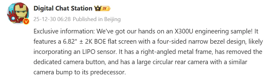 กระแสข่าวลือของ vivo X300 Ultra ยังคงถูกปล่อยออกมาอย่างต่อเนื่อง ล่าสุดแหล่งข่าวชื่อดัง Digital Chat Station (DCS) ได้ออกมาเปิดเผยรายละเอียดสำคัญเกี่ยวกับหน้าจอและดีไซน์ของว่าที่เรือธงรุ่นใหม่นี้ ซึ่งมีความเปลี่ยนแปลงที่น่าสนใจหลายจุด