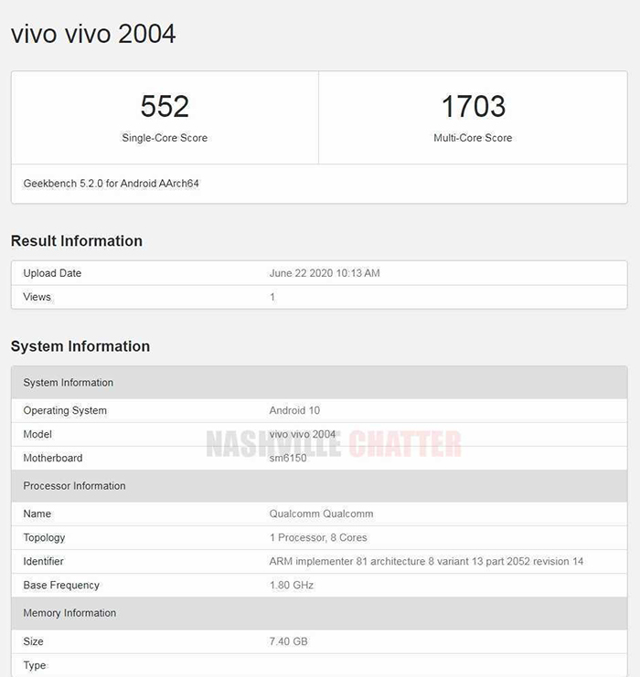 สำหรับสเปกของ Vivo รหัสรุ่น 2004 ที่ปรากฎบนแอป GeekBench มาพร้อมหน่วยประมวลผลซีพียูแบบ Octa Core ความเร็ว 1.80GHz, ชิปเซ็ท Snapdragon 675 SoC (SM6150) จับคู่กับ RAM 8GB , รันบนระบบปฎิบัติการ Android 10 และเป็นผลทดสอบสดๆ ร้อนๆ เมื่อวันที่ 22 มิถุนายนที่ผ่านมานี่เอง
