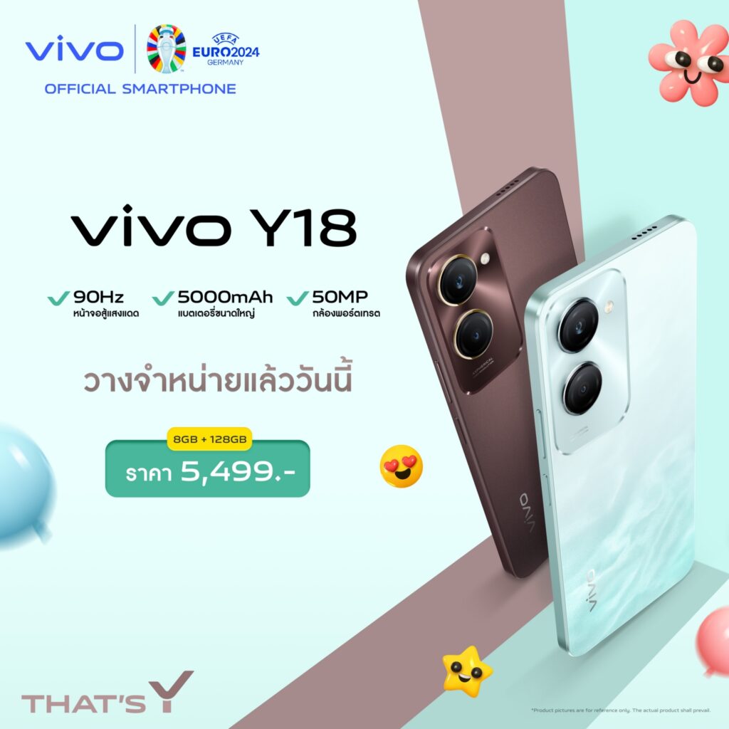 vivo ประกาศเปิดตัว vivo Y18 สมาร์ตโฟนราคาประหยัดรุ่นใหม่ตระกูล Y Series โดยมาพร้อมจุดเด่นหน้าจอที่มีอัตรารีเฟรชเรท 90Hz, ชิปเซ็ท MediaTek Helio G85 SoC, ติดตั้งกล้องหลังคู่ความละเอียด 50 ล้านพิกเซล, รองรับการกันน้ำกันฝุ่น IP54 และแบตเตอรี่ความจุ 5,000mAh