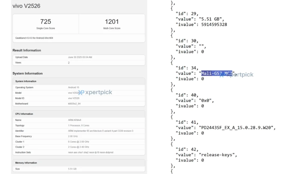 สำหรับสเปกของ vivo หมายเลขรุ่น V2526 ซึ่งคาดว่าจะเป็น vivo Y19s GT 5G ที่ปรากฎบนแอป GeekBench 6.4.0 ใช้หน่วยประมวลผลซีพียูแบบ Octa Core ความเร็ว 2.00GHz ประกอบด้วยซีพียูหกคอร์ที่ 2.00GHz และซีพียูสองคอร์ที่ 2.40GHz