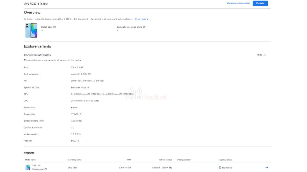สำหรับ vivo Y36s ที่ปรากฎบนเว็บ Google Play Console มาพร้อมหมายเลขรุ่น PD2318 โดยมาพร้อมหน้าจอแสดงผลความละเอียด HD+ 720 x 1612 พิกเซล และความหนาแน่นของพิกเซล 320 DPI