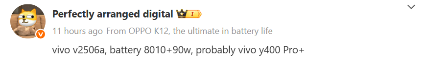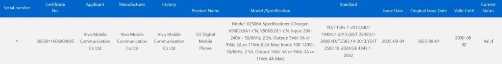 จากข้อมูลของหน่วยงานรับรอง 3C ระบุว่า vivo V2506A อาจรองรับระบบชาร์จไวสูงสุดถึง 90W ขณะที่ข้อมูลจาก CMIIT ยังเผยด้วยว่าสมาร์ตโฟนรุ่นนี้จะมาพร้อมแบตเตอรี่ขนาดใหญ่ถึง 8,010mAh