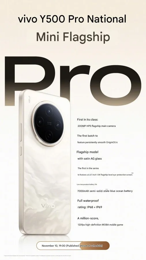 vivo Y500 Pro เตรียมเปิดตัวอย่างเป็นทางการในประเทศจีน วันที่ 10 พฤศจิกายนนี้ โดยล่าสุด vivo ได้เร่งแคมเปญโปรโมตและปล่อยทีเซอร์อย่างต่อเนื่อง ทำให้เราได้ทราบสเปกหลักของตัวเครื่องแล้ว ทั้งจากโพสต์บน Weibo และข้อมูลที่ปรากฏบน China Telecom