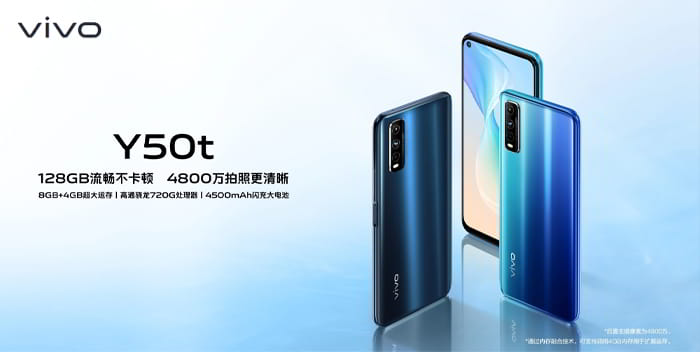vivo ประกาศเปิดตัว vivo Y50t สมาชิกใหม่ในตระกูล Y50 Series อย่างเป็นทางการที่ประเทศจีน โดยมีรูปลักษณ์ดีไซน์และสเปกที่คล้ายกับ Y70t ที่เปิดตัวไปเมื่อเดือนมิถุนายนที่ผ่าน ยกเว้นชิปเซ็ทที่ใช้ชิปเซ็ท Snapdragon 720G รองรับเฉพาะ 4G