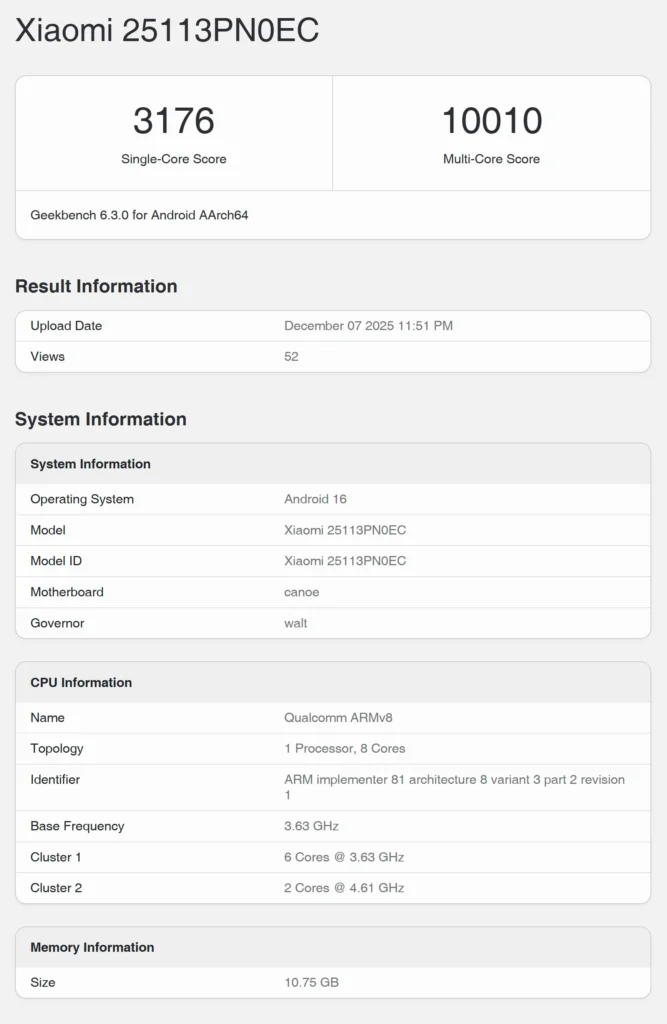 ไฮไลท์สำคัญคือขุมพลังที่คาดว่าเป็นชิปเซ็ตเรือธงรุ่นใหม่อย่าง Snapdragon 8 Elite Gen 5 ซึ่งทำคะแนนทดสอบได้น่าประทับใจ โดยคะแนน Single-core อยู่ที่ 3,176 คะแนน และ Multi-core พุ่งสูงถึง 10,010 คะแนน