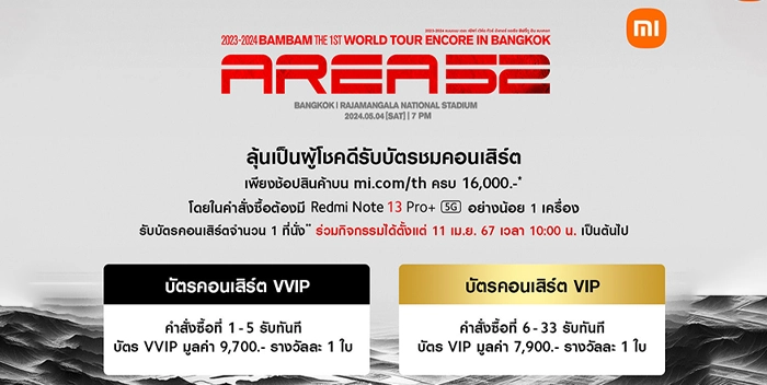 เสียวหมี่ ประเทศไทย มอบสิทธิพิเศษให้แก่ลูกค้าที่ซื้อสินค้าในระหว่างวันที่ 11–21 เมษายน 2567 ได้ร่วมรับและลุ้นบัตรชมคอนเสิร์ต 2023–2024 BamBam THE 1ST WORLD TOUR ENCORE [AREA 52] in BANGKOK Presented by Xiaomi ที่จะจัดขึ้นในวันที่ 4 พฤษภาคม 2567