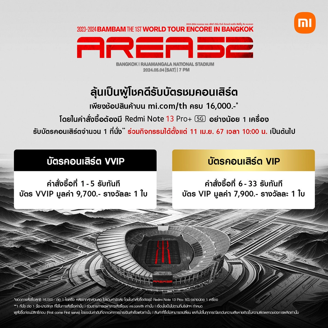 เสียวหมี่ ประเทศไทย มอบสิทธิพิเศษให้แก่ลูกค้าที่ซื้อสินค้าในระหว่างวันที่ 11–21 เมษายน 2567 ได้ร่วมรับและลุ้นบัตรชมคอนเสิร์ต 2023–2024 BamBam THE 1ST WORLD TOUR ENCORE [AREA 52] in BANGKOK Presented by Xiaomi ที่จะจัดขึ้นในวันที่ 4 พฤษภาคม 2567