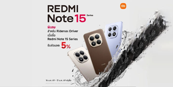 โดยมอบส่วนลดทันที 5%1 เมื่อซื้อ REDMI Note 15 Series ทุกรุ่นตั้งแต่วันนี้ – 31 มกราคม 2569 ที่ Xiaomi Store หรือที่เว็บไซต์ www.mi.com/th15 เพียงกดรับโค้ดส่วนลดในแอปพลิเคชันของผู้ให้บริการของตนเอง แล้วมาแสดงหน้าร้านหรือกรอกลงในเว็บไซต์ก่อนขั้นตอนการชำระเงิน