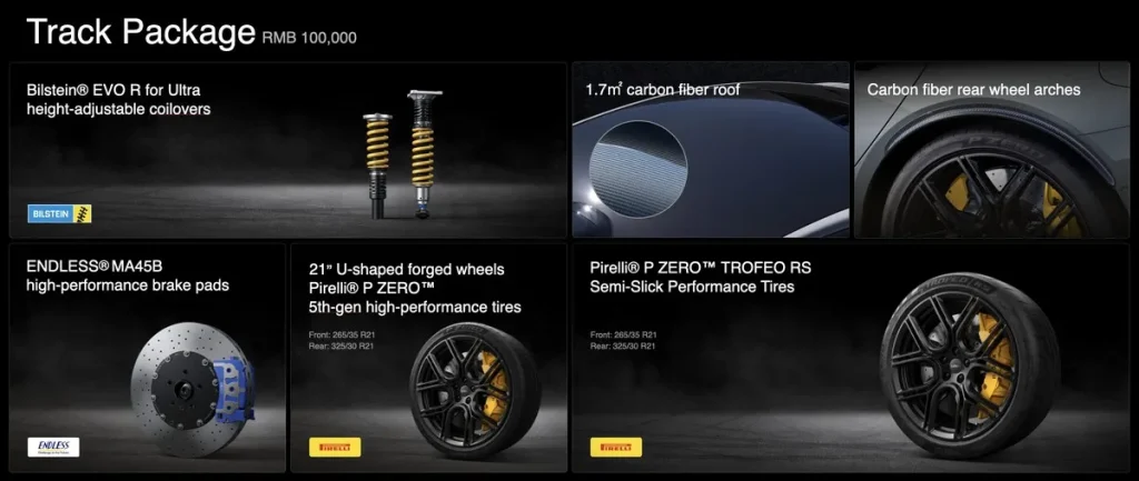 สำหรับผู้ที่ต้องการความสามารถในการแข่งขันในสนามแข่งที่มากยิ่งขึ้น “Track Package” ยังมาพร้อมอุปกรณ์เสริมที่ประกอบไปด้วย โช้คอัพคอยล์โอเวอร์ Bilstein EVO R for Ultra, ผ้าเบรกประสิทธิภาพสูง ENDLESS, ยางประสิทธิภาพสูง Pirelli P ZERO เจเนอเรชัน 5, ยาง Semi-Slick Pirelli P ZERO TROFEO RS ที่ให้มาเพิ่มเติมม ล้อฟอร์จรูปตัว U ขนาด 21 นิ้ว ซุ้มล้อหลังคาร์บอนไฟเบอร์ และหลังคาคาร์บอนไฟเบอร์ขนาด 1.7 ตร.ม. ซึ่งแพ็กเกจนี้มีราคาอยู่ที่ 100,000 หยวน ทำให้ราคารถรวมอยู่ที่ 629,900 หยวน