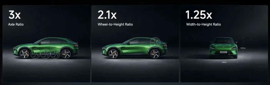 ภายนอกตัวรถมีอัตราส่วนระยะฐานล้อต่อความยาวตัวถัง 3:1 อัตราส่วนขนาดล้อต่อความสูงตัวรถ 2.1:1 และอัตราส่วนความกว้างต่อความสูงตัวรถ 1.25:1 ซึ่งเป็นพื้นฐานของรูปลักษณ์ที่น่าดึงดูด สัดส่วนที่สมดุลอย่างพิถีพิถันเหล่านี้ทำให้ Xiaomi YU7 มีทรวดทรงที่ดูลู่ลมและคลาสสิกตามแบบฉบับของรถ SUV สมรรถนะสูง อัตราส่วนด้านหน้าต่อตัวถังที่เพรียวบางเป็นพิเศษที่ 1:3 ช่วยยืดส่วนหน้าของรถให้ยาวขึ้น ทำให้ฝากระโปรงหน้าดูยาวและโดดเด่น ซึ่งเป็นเอกลักษณ์ของความหรูหราในวงการยานยนต์ที่สั่งสมมานานกว่าศตวรรษ