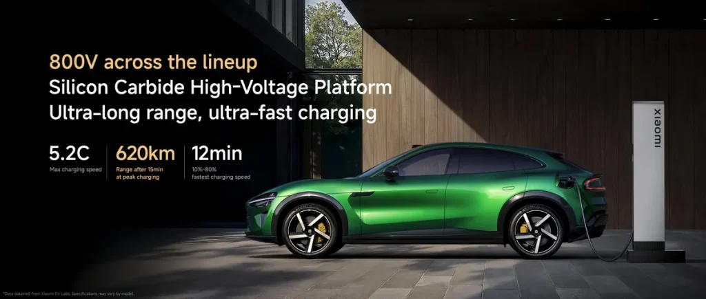 สมรรถนะการวิ่งระยะไกลที่น่าประทับใจของ Xiaomi YU7 เป็นผลมาจากแพลตฟอร์มขับเคลื่อนไฟฟ้าที่ล้ำสมัย ในทุกรุ่นย่อย Xiaomi YU7 มาพร้อมกับแพลตฟอร์มซิลิคอนคาร์ไบด์ 800V รองรับการชาร์จเร็วสูงสุด 5.2C สามารถชาร์จจาก 10–80% ในเวลาเพียง 12 นาที และสามารถชาร์จเพื่อให้วิ่งได้ไกลถึง 620 กม. ใน 15 นาที