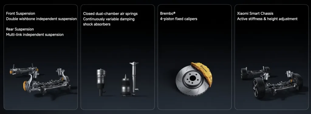 Xiaomi YU7 มาพร้อมระบบกันสะเทือนหน้าแบบอิสระปีกนกคู่ (Double Wishbone) และระบบกันสะเทือนหลังแบบอิสระ 5-link, ถุงลมแบบ Dual-Chamber Closed Air Springs + โช้คอัพปรับความหนืดต่อเนื่องประสิทธิภาพสูง, คาลิเปอร์เบรก Brembo® แบบ 4 พอต, Xiaomi Smart Chassis และอื่น ๆ อีกมากมาย แตกต่างจาก Xiaomi SU7 ที่เน้นความสปอร์ต
