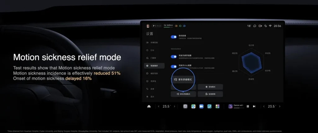 สุดท้ายนี้ สำหรับผู้ที่เมารถง่าย เสียวหมี่ได้ร่วมมือกับโรงพยาบาล Huashan และโรงพยาบาล Beijing Tongren เพื่อร่วมกันพัฒนาโหมดลดอาการเมารถ (Motion Sickness Relief Mode) หลังจากการศึกษาอัตราการเต้นของหัวใจ การเคลื่อนไหวของดวงตา การนำไฟฟ้าของผิวหนัง และการตอบสนองอื่นๆ
