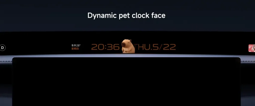 และฟีเจอร์ที่สามารถตอบโต้กับผู้ใช้ยังไม่หมดเพียงเท่านี้ Smart Cabin ที่ขับเคลื่อนด้วย HyperOS ของ Xiaomi YU7 มีการโต้ตอบที่น่าสนใจมากมาย เมื่ออยู่ในโหมดจอดรถ (Park) คุณสามารถร้องคาราโอเกะได้โดยไม่ต้องใช้ไมโครโฟน เพิ่มเสน่ห์ให้กับประสบการณ์ด้วยเพื่อนร่วมทางที่เป็นสัตว์เลี้ยงแอนิเมชัน ทั้งคาปิบาราและนาก ซึ่งทำหน้าที่เป็นนักบินร่วม สัตว์เลี้ยงเสมือนจริงเหล่านี้จะเงี่ยหูฟังเมื่อมีคำสั่งเสียงถึงผู้ช่วย AI XiaoAi ตอบสนองต่อแรง G อย่างเป็นธรรมชาติขณะเลี้ยว และยังเล่นข้ามหน้าจอเมื่อผู้โดยสารเรียกใช้ XiaoAi ทำให้เด็ก ๆ ในรถสามารถโต้ตอบได้อย่างสนุกสนาน