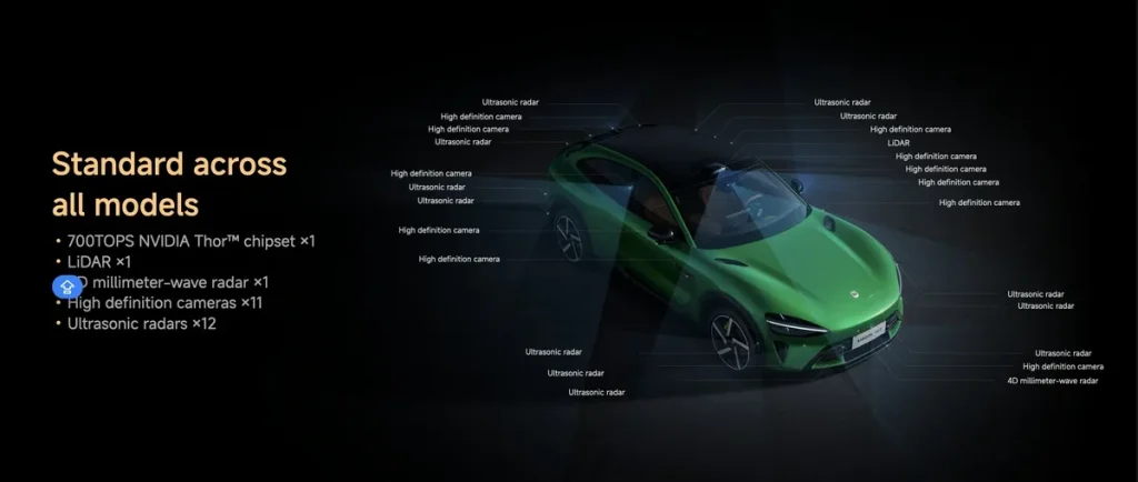 Xiaomi YU7 ทุกรุ่นมาพร้อมกับฮาร์ดแวร์ระบบขับขี่อัตโนมัติขั้นสูงเป็นมาตรฐาน ซึ่งรวมถึงชิป NVIDIA DRIVE AGX Thor™ รุ่นใหม่ที่มีพลังการประมวลผล 700 TOPS, LiDAR, เรดาร์คลื่นมิลลิเมตร 4D, กล้องความละเอียดสูง 11 ตัว และเรดาร์อัลตราโซนิก 12 ตัว ในจำนวนนี้มีกล้องป้องกันแสงสะท้อนที่คมชัดเป็นพิเศษ 7 ตัวที่ใช้เทคโนโลยีเคลือบ ALD ซึ่งช่วยลดแสงจ้าและการรบกวนจากแสงย้อนได้อย่างมีประสิทธิภาพ