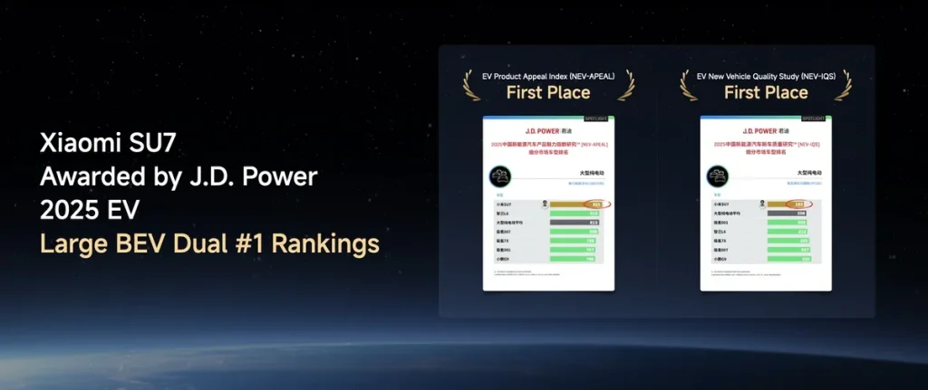 และได้รับการจัดอันดับห้าดาวภายใต้มาตรฐาน C-NCAP ที่ปรับปรุงใหม่ โดยได้คะแนนระดับชั้นนำในคลาส ในรายงาน New Energy Vehicle ปี 2025 ของ J.D. Power, Xiaomi SU7 ยังครองอันดับหนึ่งในสองหมวดหมู่สำคัญในกลุ่มรถยนต์ไฟฟ้าขนาดใหญ่อีกด้วย