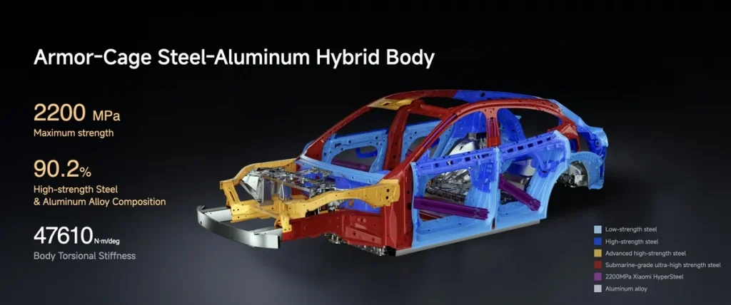 ด้วยวัสดุที่ล้ำสมัยนี้เป็นรากฐาน Xiaomi YU7 จึงมีโครงสร้างตัวถังแบบไฮบริดเหล็ก-อะลูมิเนียม Armor-Cage ที่ได้รับการอัปเกรดใหม่ทั้งหมด ประกอบด้วยเหล็กกล้าความแข็งแรงสูงและอลูมิเนียมอัลลอยด์ 90.2% ความแข็งแกร่งต่อการบิดตัว (Torsional stiffness) สูงถึง 47,610 นิวตันเมตร/องศา ทำให้เป็นหนึ่งในรถที่มีสมรรถนะสูงสุดในกลุ่ม SUV ในด้านความปลอดภัยเชิงรับ (passive safety)