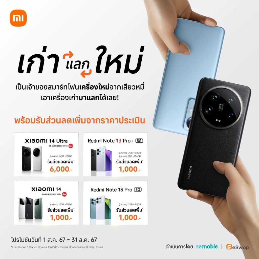 เสียวหมี่ ประเทศไทย ให้คุณเป็นเจ้าของสมาร์ทโฟนรุ่นยอดฮิตอย่าง Redmi Note 13 Series และ Xiaomi 14 Seriesได้ง่ายขึ้นด้วยโปรแกรมพิเศษในช่วงเดือนสิงหาคม อาทิ โปรแกรมการผ่อนจาก SG Finance+1 หรือ โปรแกรมการนำเครื่องเก่ามาแลกเครื่องใหม่พร้อมรับส่วนลดเพิ่มเติม3 โดยผู้ที่สนใจสามารถสอบถามข้อมูลเพิ่มเติม ได้ที่ Xiaomi Store และร้านตัวแทนจำหน่ายที่ร่วมรายการ