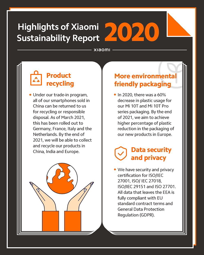 รายงานฉบับดังกล่าวอธิบายวิธีการทำงานของเสียวหมี่เพื่อผสานการอนุรักษ์สิ่งแวดล้อมในกระบวนการต่างๆ เช่น การออกแบบผลิตภัณฑ์ หรือผลพวงต่อสิ่งแวดล้อมจากกระบวนการผลิต ยกตัวอย่างเช่น เสียวหมี่ลดปริมาณพลาสติกที่ใช้กับบรรจุภัณฑ์ของสมาร์ทโฟน Mi 10T และ Mi 10T Pro ลงร้อยละ 60 และภายในสิ้นปี 2021 เสียวหมี่ตั้งเป้าที่จะลดปริมาณพลาสติกสำหรับบรรจุภัณฑ์ของผลิตภัณฑ์ใหม่ที่จำหน่ายในทวีปยุโรปลงอีก
