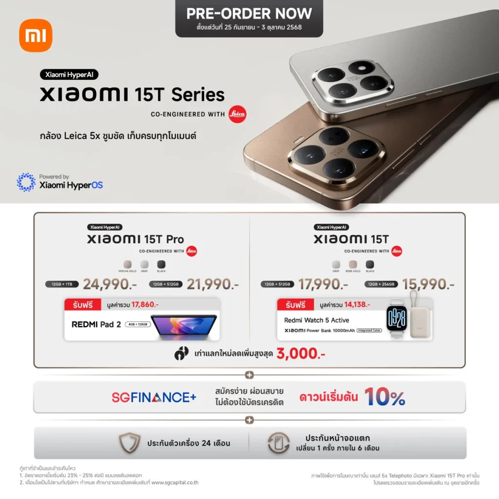 นอกจากนี้ เสียวหมี่ ประเทศไทย ยังร่วมกับ เอสจี แคปปิตอล ให้ลูกค้าเป็นเจ้าของสมาร์ทโฟน Xiaomi 15T Series ด้วยโปรแกรม SG Finance+ สมัครง่าย ผ่อนสบาย อนุมัติไว ไม่ต้องใช้บัตรเครดิต ได้แล้ววันนี้ที่ Xiaomi Store และร้านตัวแทนจำหน่ายที่ร่วมรายการ โดยดาวน์เริ่มต้น 10%14