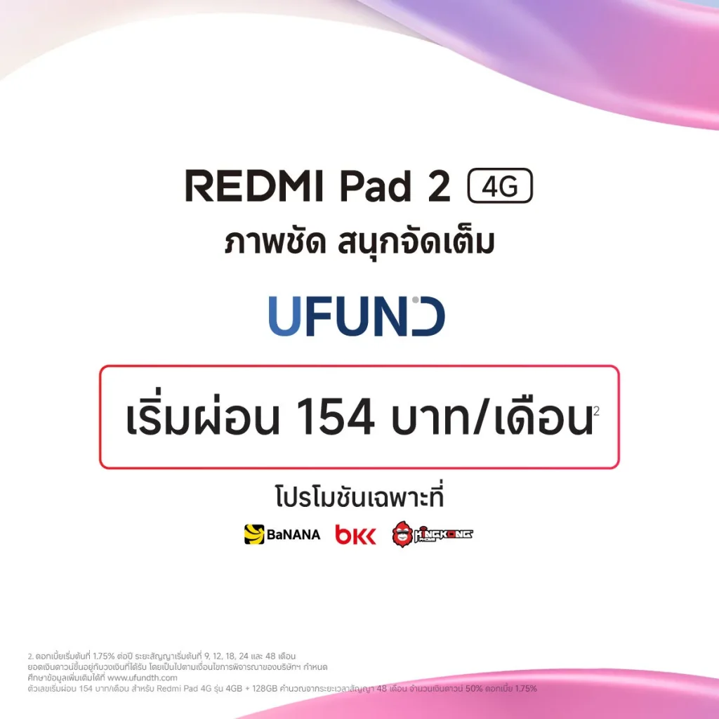 นอกจากนี้ ผู้ที่สนใจยังสามารถเป็นเจ้าของแท็บเล็ต Redmi Pad 2 4G ได้ง่ายขึ้นผ่านโปรแกรมสินเชื่อ8 SG Finance+ สำหรับผู้ที่ซื้อสินค้าผ่านร้าน Jaymart, IT CITY, TG FONE, AIS Shop, True Shop และโปรแกรมสินเชื่อ8 UFUND สำหรับผู้ที่ซื้อสินค้าผ่านร้าน BaNANA, BKK, KingKong Phone